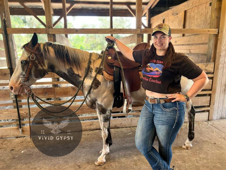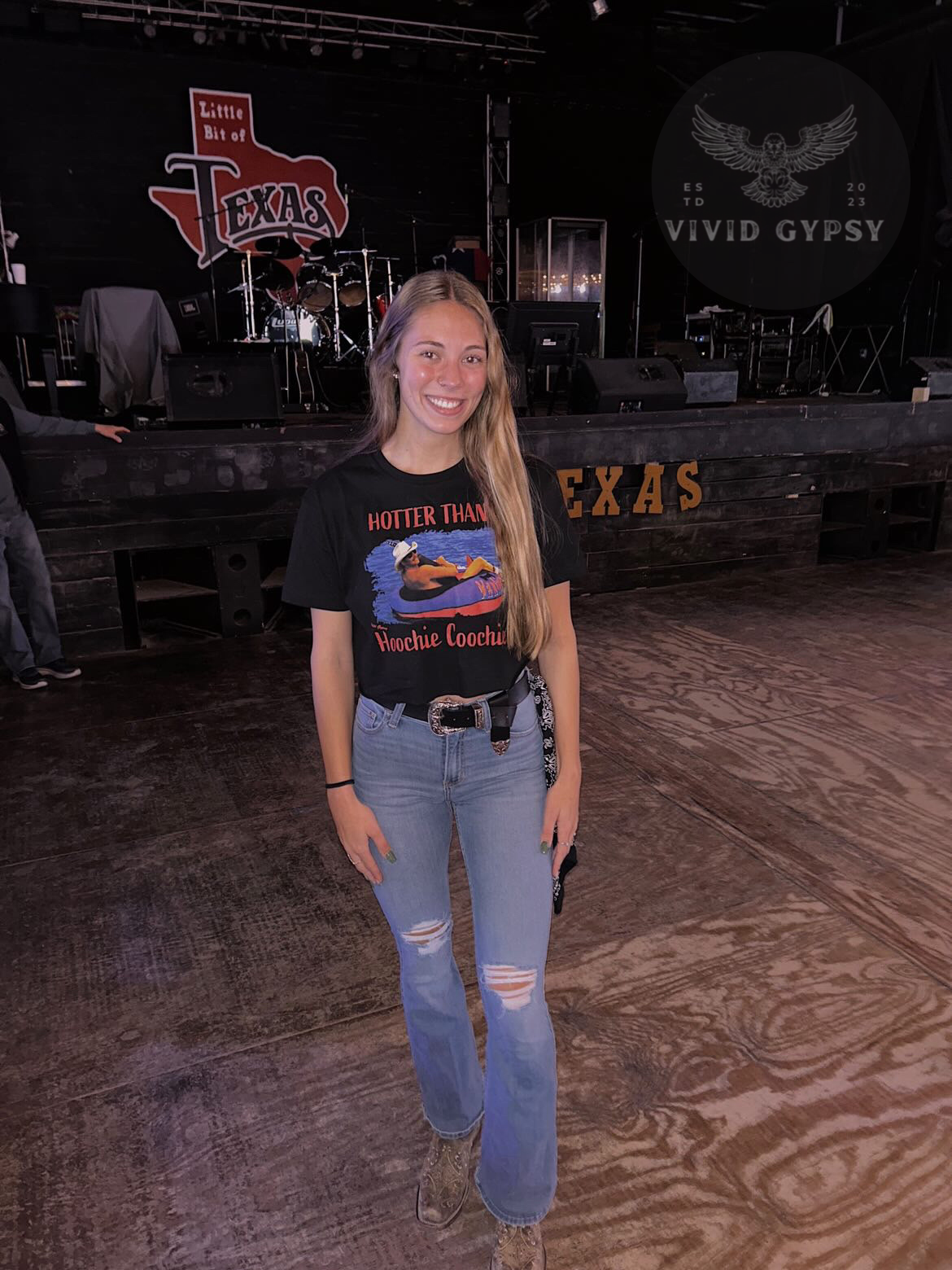 Yeehaw! Saddle up and get ready to show off your sass and style with our Vivid Gypsy black crop top. This top features a bold and playful message on the front that reads "Hotter Than A Hoochie Coochie," making it the perfect addition to any cowgirl's wardrobe. The flattering cut of the top shows off your abs and highlights your best features, while the versatile black color makes it easy to pair with any bottoms. Whether you're two-stepping at a honky-tonk or hitting the rodeo, this top is sure to turn heads and make you feel confident and empowered. So grab your boots and hat, partner, and get ready to show off your unique personality with this fun and creative crop top from Vivid Gypsy!