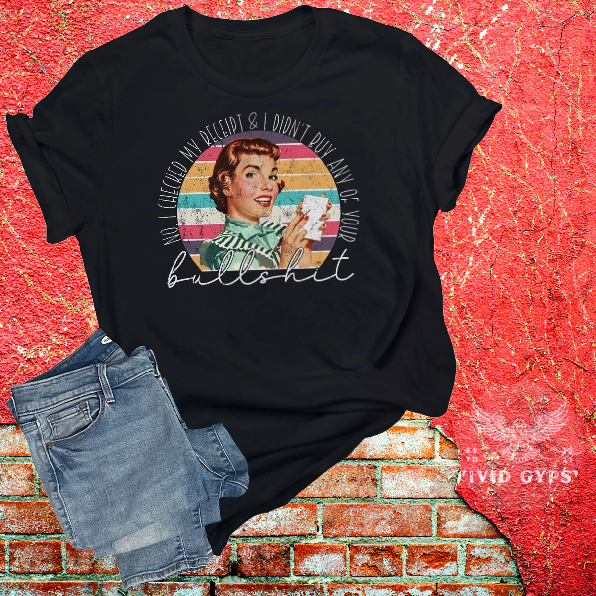 Howdy, folks! Step right up and grab yourself the 'No, I Checked My Receipt and I Didn't Buy Any of Your BS' t-shirt. This here garment is as bold as a bucking bronco and as honest as a cowboy's handshake. Perfect for those who ain't afraid to call it like they see it, this shirt is your trusty companion on the wild frontier of life. Wear it proud, and let the world know you're not buying any tall tales. Giddy up!